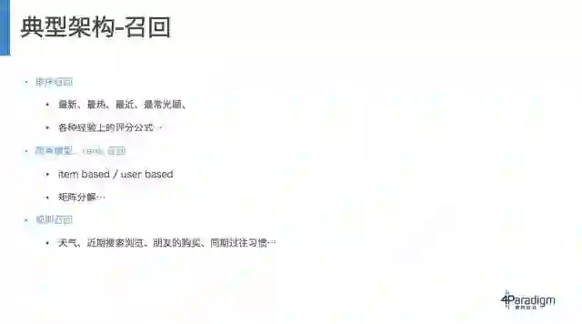 现在说一下推荐系统的一个典型架构,大致是三块:召回、排序、生成推荐列表。