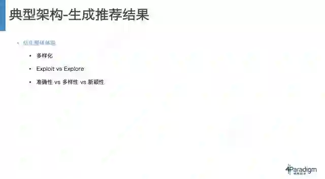 作为推荐系统来说也是,我们希望结果尽量多样化,这个用户最喜欢的领域是足球,最喜欢梅西,凡是梅西的话题必点,但是我们也不可能只推荐梅西的内容给他,那他可能就这个系统绝望了。用户还是希望看到多样化的内容,时政娱乐军事都需要。从体验上来讲,也要权衡,是着重挖掘,根据现在已知到的用户喜欢的内容不断去展现;还是要考虑到给用户展现不同内容,来收集他其他的领域的一些偏好。虽然会有推荐用户不喜欢推荐内容的风险,但其实也有可能收获到用户喜欢的一个新领域,那我们之后的推荐选择面会更广,用户体验也会更好。除此之外,这个推荐系统,在准确性、多样性和新颖性上也需要有一定的权衡。