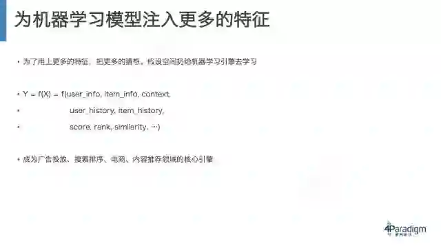 这些更多的特征可以注入到机器学习这个算法模型中,去提供更多的选择,也就是我们提供了更多的空间,这个空间就不限于之前的评分公式,不限于之前的rank方法,不限于之前兴趣维度的预测指标。可以把更多更丰富的信息放进去,包括用户的信息,商品的信息,当前的一些信息比如天气,最近的情况,用户之前买过什么等等。