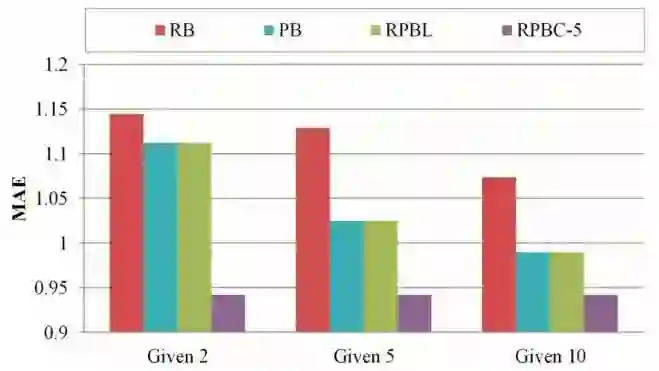 如图1所示,根据用户的评分数据以及心理学中的TIPI量表测量得到的大五人格数据,他们使用皮尔逊系数来分别计算两个用户的评分相似性和性格相似性。图2展示了他们的实验结果,可以发现融入性格特征的协同过滤算法能够更好地解决推荐里面常常遇到的冷启动问题。