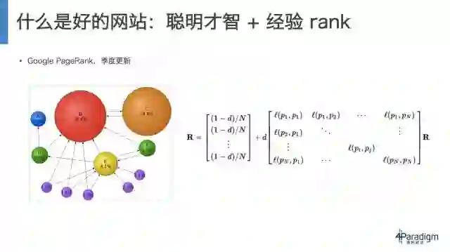 然后说一下Google以前给搜索结果排名的一个方式:PageRank,其实就是用一个公式去衡量什么是好的网站。思路比较像论文的引用,就是说一篇论文被引用得越多,那么可能它影响力更大,越被人们相。进一步推就是,我的论文被引用,得分会更高。