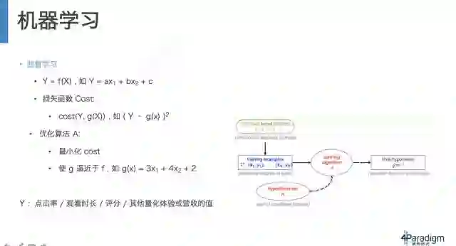 那么这就说到机器学习的概念,机器学习在里面大概就是假设这个世界里有一个真理,这个真理做的事情就是f,我根据当前的情况,这是个什么样的人,今天天气怎么样,这是个什么样的内容,这些种种情况,推断出这个人是不是喜欢这个item。