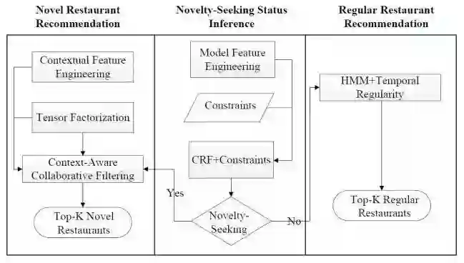 因此,为了区分是推荐去过的餐馆还是推荐新餐馆,我们从用户的历史就餐行为中学习用户对新餐馆的偏好,而这正是用户性格中的猎奇特性。在下一次餐馆推荐时,首先预测用户是否会选择新餐馆,针对新餐馆和去过的餐馆分别设计不同的推荐算法。