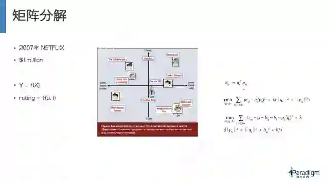 在这种机器学习的方式下,诞生了更多更好的推荐方式,大概在2006、2007年之前,还是普遍应用之前讲到的协同过滤的方式来做推荐,2006年Netflix设立了一个奖项,说谁能把点击率提高10%,就能拿到100万美金的奖赏,这个奖大概在一年后就被人拿到了,而用这种方法就是机器学习中矩阵分解的方法。