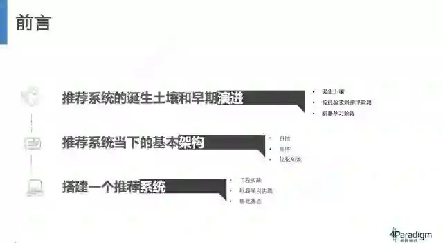这个话题还蛮大的,我也只是从过往的经验里摸出了一条线,所以跟大家分享一下比较宏观的认识。主要从三个方面来说:推荐系统的诞生土壤和早起演进;推荐系统当下的基本架构;如何搭建一个推荐系统。