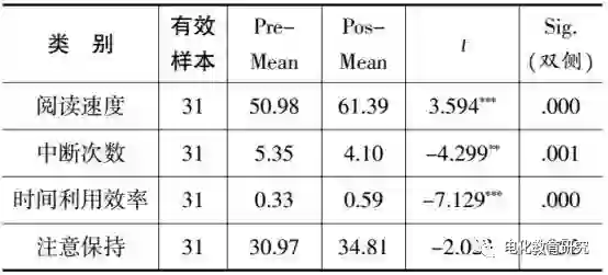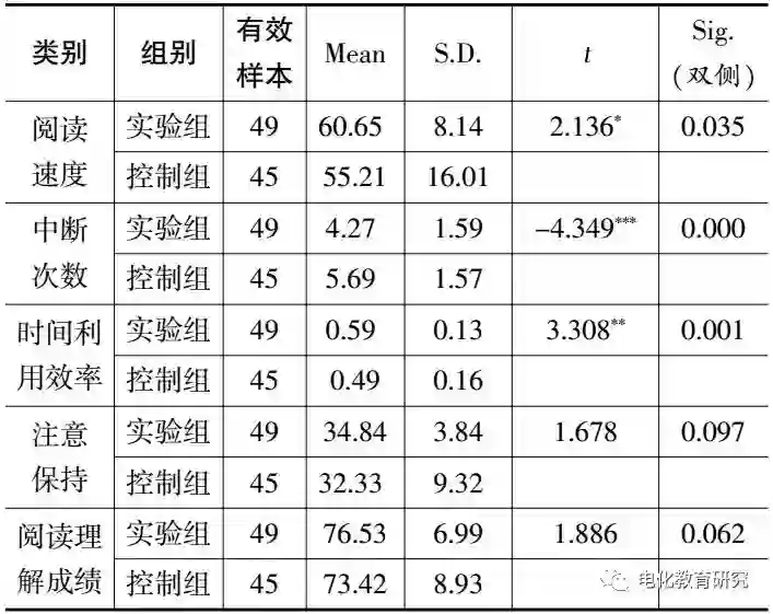 学习效果分为效率和结果两个方面。通过持续6周的实验,可以看到实验组学习者在时间利用、阅读中断等效率指标方面得到了显著的改善。这一现象说明他们在阅读过程中调动了更多的积极因素,努力将自己的注意力保持在阅读活动中,从而提升了学习的效率。C.Chen和S.Huang从脑科学的角度对这种改变进行了诠释,他们发现基于脑电信号的注意力测量和信息反馈不仅能够帮助学习者调整专注度、努力程度、时间利用效率,还有益于激发阅读兴趣和积极性[24]。