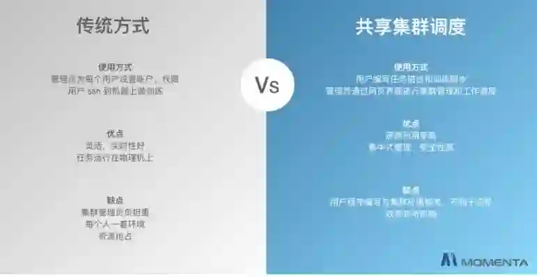 与传统方式相比,Momenta采用的共享集群调度让用户(内部的算法研发人员)可以编写任务描述和训练脚本,而管理员通过网页界面进行集群管理和工作调度。极大地节省人工成本,提高资源利用率,实现集中性管理,提高安全性。