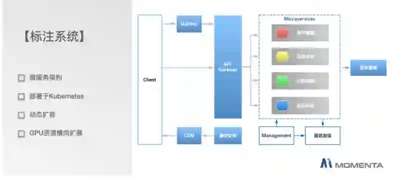 Momenta为内部算法研发人员服务的标注系统,可以实现用户管理、任务分发、计费、结算和自动审核。自动审核是比较特殊的,在一般场景和服务中用得比较少,自动审核是指用Momenta的模型来证实用户(在平台上兼职标注的人员)的标注结果是否符合需求或预期,主要是应付较大的用户访问,特别是节假日的时候。(节假日期间平台的用户比较闲,会希望在平台上赚点零花钱。)