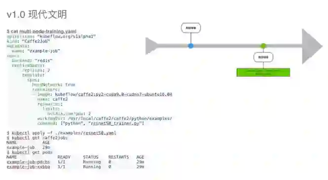 在现代文明阶段,所有调度和管理工作都通过容器进行,可以同时管理几百台机器。能够进入这个阶段主要是靠众多开源社区的努力和合作,比如 TensorFlow和Kubernetes的强强联合便诞生了Kubeflow。