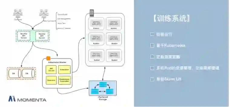 训练系统是基于K8S搭建使用的,能够实现自己的调度。K8S作为容器的调度平台,默认是调度一个pod在不同的机器上面运行的,但是做多机训练可能需要同时使用多个Pod,每个机器上面一个Pod。这样就需要相应的管理以及生命周期的维护,我们这套系统是基于K8S做的开发,承担这样的工作。