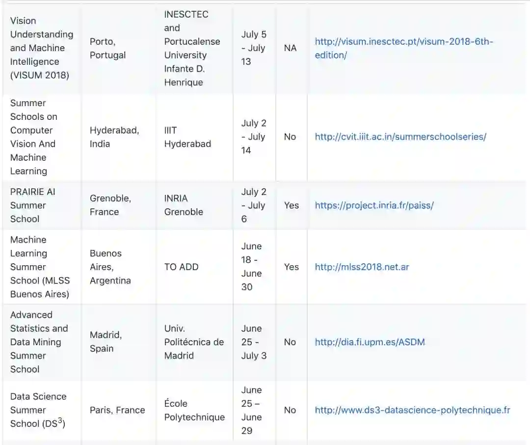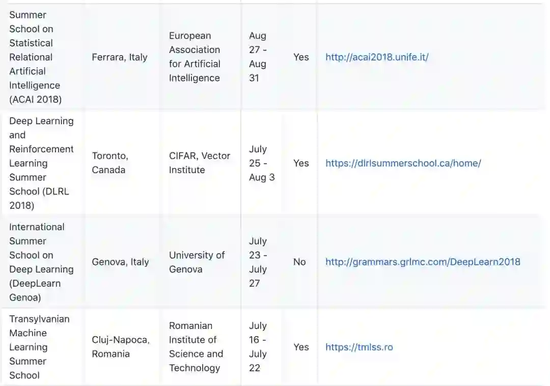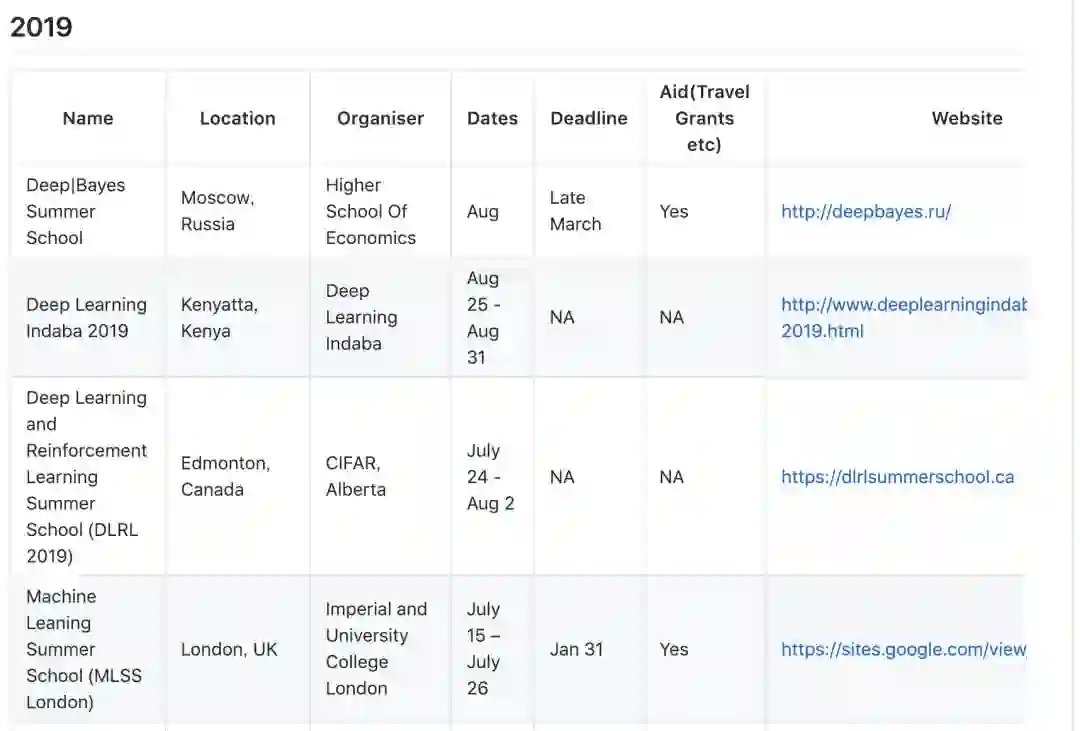 在此列表中,作者列出了这些暑期学习的开办地点、组织方、日期、截止日期、是否有资助等信息。其中包括我们所熟知的由 CIFAR 等机构主办的 DLRL 暑期学校。