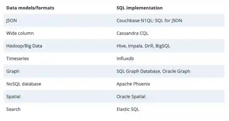 另一个数据库阵营是 NoSQL。虽然现在对 NoSQL 的定义是“Not Only SQL”,但其实 NoSQL 在最开始想要远离 SQL,并尝试使用其他语言和框架,比如 map-reduce。但在十年之后,几乎每一个流行的 NoSQL 数据库都有了 SQL 变种:Couchbase 的 N1QL、Cassandra 的 CQL 和 Elasticsearch 的 ElasticSearch SQL。你可能会说:“MongoDB 并没有 SQL”。但我敢肯定地说:“它将会有一个非常简单的 SQL 实现”。