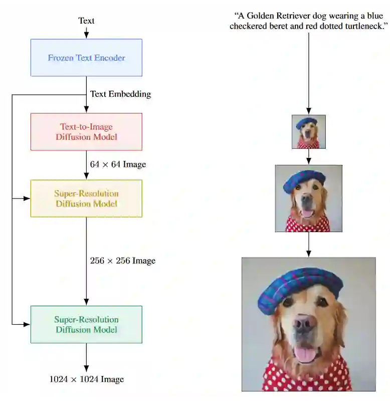 Imagen [6] 生成模型还没有公布代码和模型,从论文中的模型结构来看,似乎除了文本编码器之外,是由一个文本-图像扩散模型来实现图像生成和两个超分辨率扩散模型来提升图像质量。