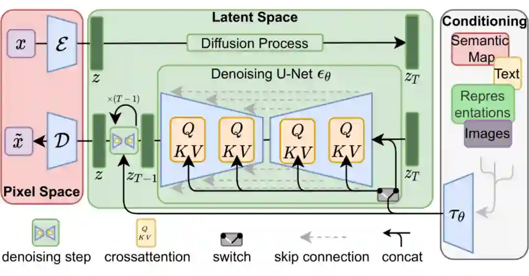 朴素的 DDPM 扩散模型,每一步都在对图像作“加噪”、“去噪”操作。而在 Stable diffusion 模型中,可以理解为是对图像进行编码后的 image tokens 作加噪去噪。而在去噪(生成)的过程中,加入了文本特征信息用来引导图像生成(也就是图中的右边 Conditioning 部分)。这部分的功能也很好理解,跟过去在 VAE 中的条件 VAE 和 GAN 中的条件 GAN 原理是一样的,通过加入辅助信息,生成需要的图像。