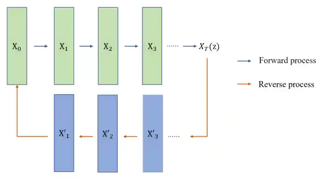 在随机过程中,有这样一个定理。一个模型的状态转移如果符合马尔科夫链的状态转移矩阵时,当状态转移到一定次数时,模型状态最终收敛于一个平稳分布。这个过程也可以理解为溶质在溶液中溶解的过程,随着溶解过程的进行,溶质(噪声)最终会整体分布到溶液(样本)中。这个过程可以类比理解为 VAE 中的 encoder。而逆向过程(Reverse process)可以理解为 decoder。通过