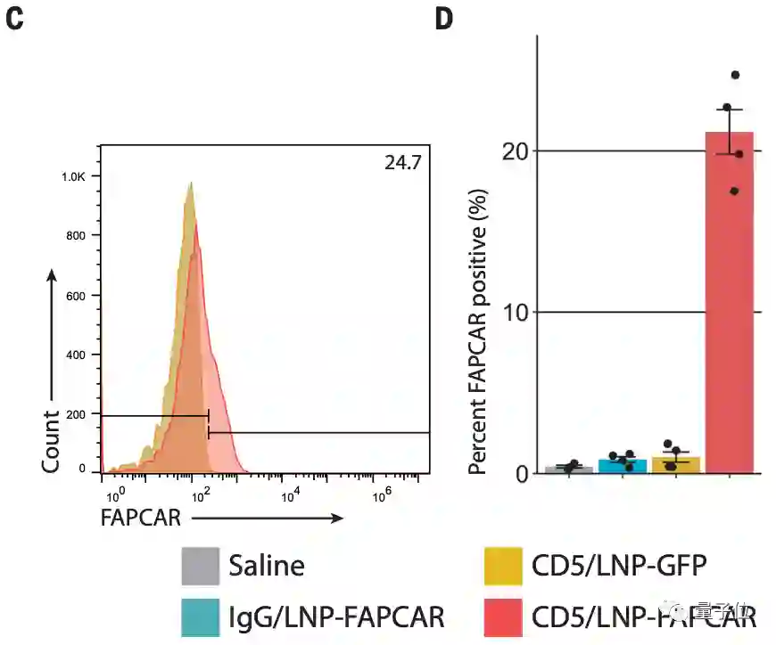 而大量数据也表明,在注射成功后,小鼠体内确实瞬时产生了FAP CAR-T细胞: