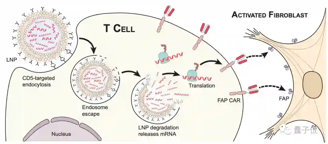 然后,封装的mRNA就会转化为功能蛋白,使T细胞获得特异性靶向攻击心肌成纤维细胞的能力。
