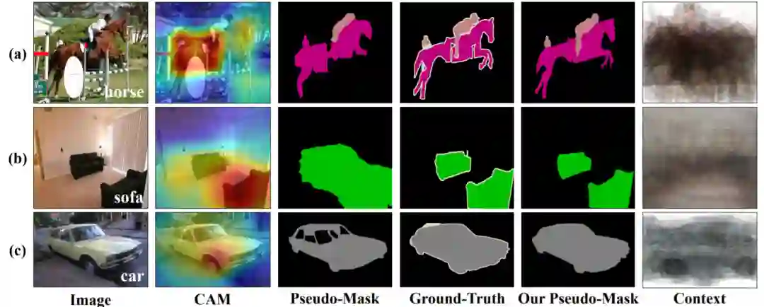 然而在弱监督语义分割的task中,上下文先验C本身是不可知的。我们能拿到的所有的信息只有图像X,图像类别标签Y,以及通过X和Y产生的pseudo-mask。
