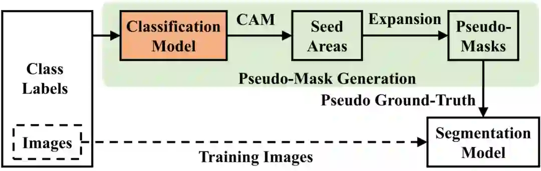 图 1. 目前流行的基于image-level class label的弱监督segmentation模型