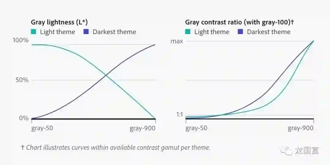 Adobe 的Spectrum 色彩体系有三个主题,分别是浅色(light)、深色(dark)、最深色(darkest)。以往在浅色主题转换至深色主题的时候,只是简单的进行对比度翻转。