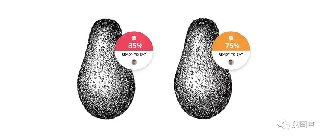 此外,盒马在牛油果“不熟”、“成熟”和“熟透” 3 种成熟度的基础上更进一步,更加精准告诉顾客对于同样熟了的牛油果,哪颗可以先吃(85%),哪颗可以后吃(75%)。