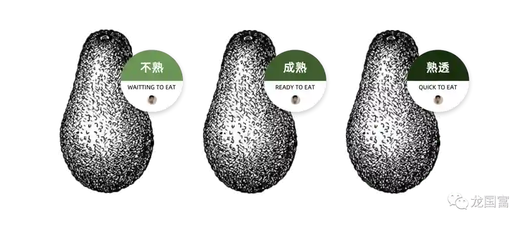 在盒马鲜生,牛油果的标签上会通过印有青绿色、褐绿色和墨绿色三种颜色,分别标注“不熟”、“成熟”和“熟透”字样,告知消费者成熟度。