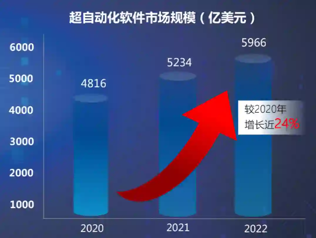 从行业发展看,不光国内的超自动化厂商在寒冬下仍能获得资本青睐,国外在超自动化领域不光有公司成功上市,更有估值百亿美元的独角兽领跑细分赛道。Gartner预测,2022年全球范围内的可支持超自动化软件市场会达到近6000亿美元,较2020年增长近24%。