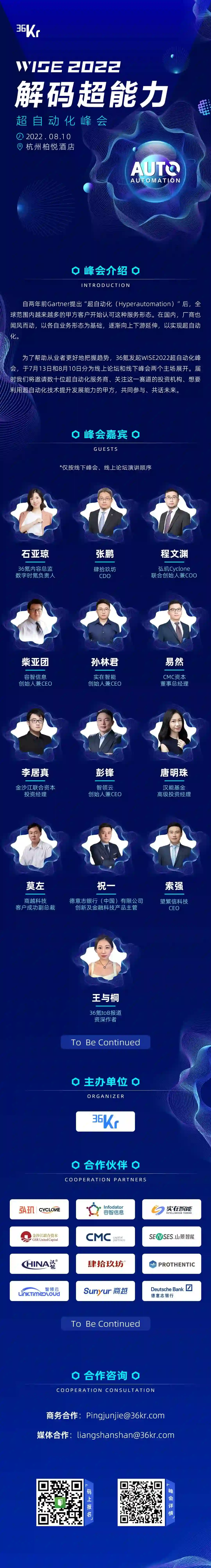 为了进一步关照行业发展难点,厘清发展重点,从商业角度看超自动化目前的落地情况等等,36氪发起WISE2022超自动化峰会,于7月13日和8月10日分为线上论坛和线下峰会两个主场展开。其中7月13日线上论坛,我们邀请到了弘玑Cyclone、智领云、商越科技、繁望信、CMC资本、金沙江联合资本、汉能基金、德意志银行(中国)有限公司等关注超自动化领域的甲乙方企业、投资机构,以对谈的形式与大家共话“超能力”。