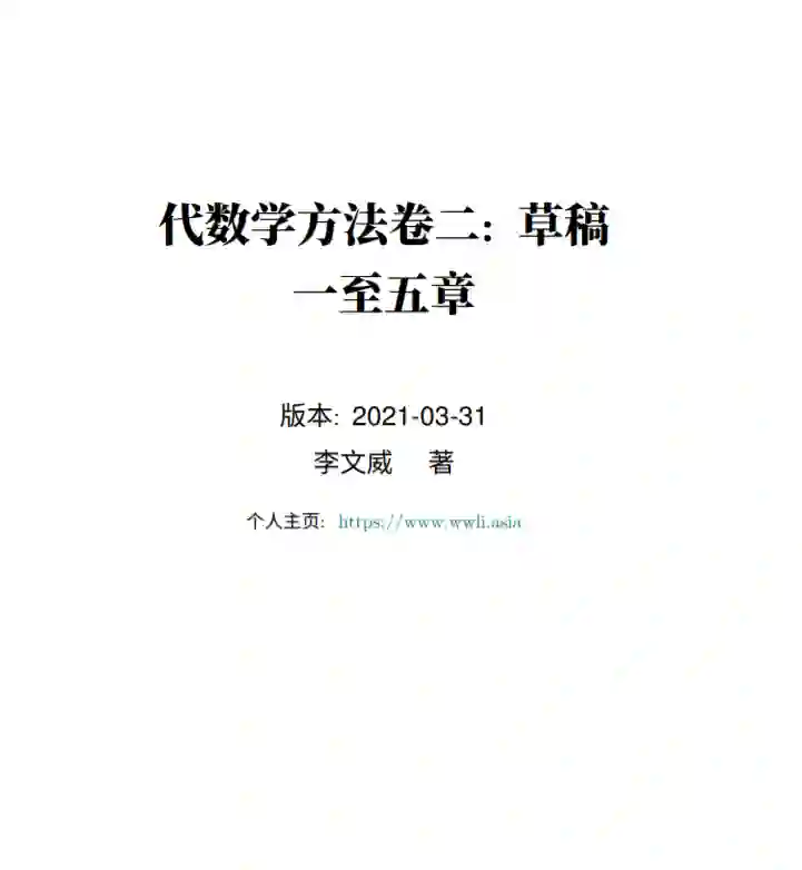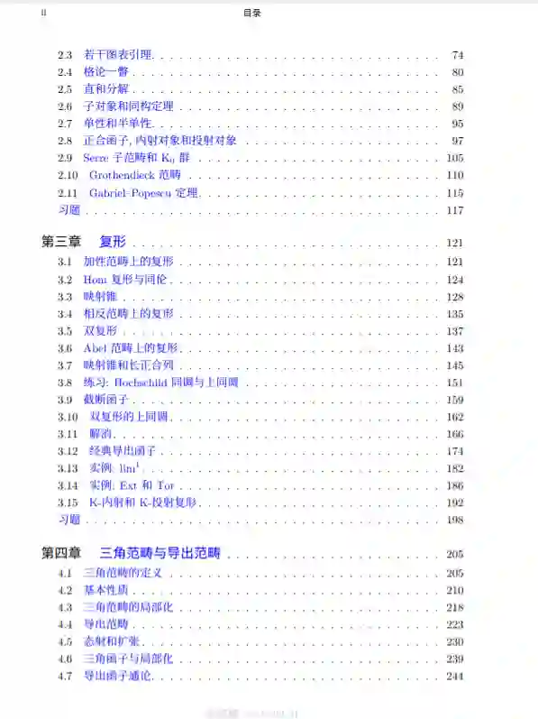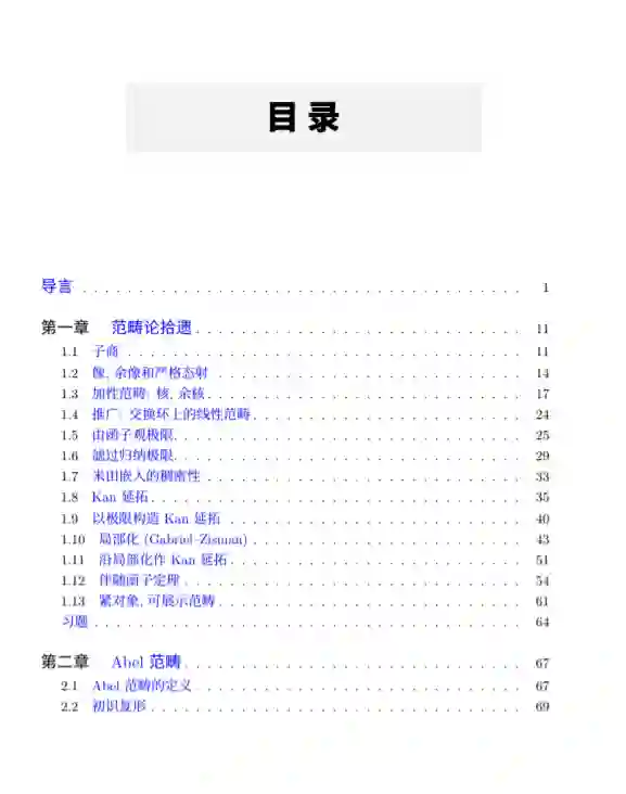 本卷的编写精神大致上和卷一类似, 但由于处理的内容不同, 具体风格也有所改变. 这些差异只能在未来的导言里仔细解释. 如同卷一, 本书并不鼓励初学者循序阅读, 除 非对抽象方法已经有充分高的接受度. 具体的阅读须知将见于导言和每章开头, 遗憾的 是这些内容只有待全书定型后方能撰写. 编撰过程中广泛参考了各种相关著作, 一部分已在正文引用, 剩余部分计划待全书 完成后在导言部分列出, 并非有意遗漏, 敬请谅解. 当前内容大致相当于传统上的同调代数, 这是本真意义的 “线性代数” 的一个真子 集. 从现代的观点看, 前五章达到了一个勉强够用的体系, 但即使作为经典同调代数的。
