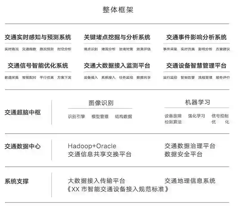 技术架构:感知层+计算基础平台+数据资源平台+城市算法服务平台+视频分析服务平台+交通智能应用+安全防护等。