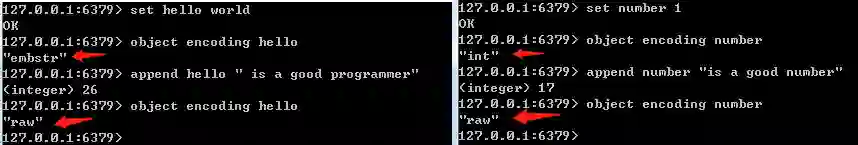 int编码字符串对象和embstr编码字符串对象在一定条件下会转化为raw编码字符串对象。embstr:<=39字节的字符串。int:8个字节的长整型。raw:大于39个字节的字符串。