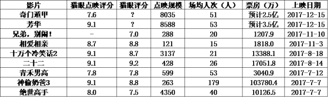 两部影片的点映成绩悲喜交加,《奇门遁甲》猫眼7.6分,淘票票7.8分,《芳华》猫眼9.1分,淘票票9.1分,从评分不难看出《奇门遁甲》的口碑非常低迷,《芳华》头炮打的响亮。