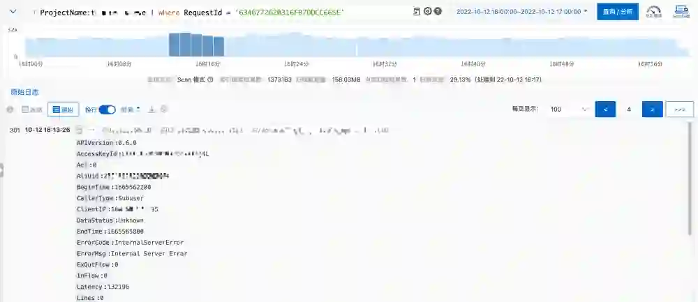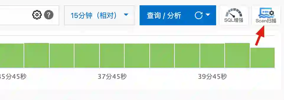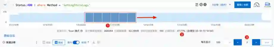 一次 Scan 未查到结果,不能代表整个时间段内没有数据(尤其是大规模数据下的稀疏命中场景,例如查询 RequestId),SLS 提供一个快进按钮 >>> 帮助快速跳过空结果的 Scan 翻页。