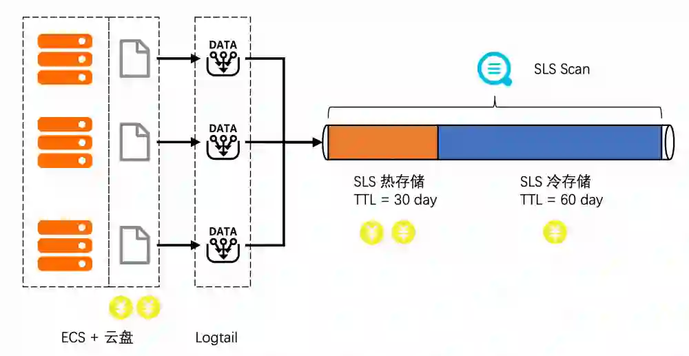 2. SLS 日志存储支持冷、热分层,超过 30 天后转为冷存,冷存单价是高效云盘的 50%。