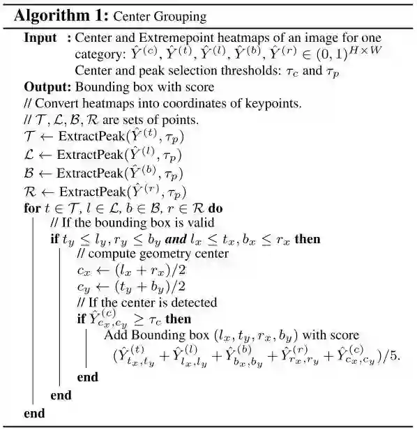作者使用了最佳的关键点估计框架,通过对每个目标类预测4个多峰值的heatmaps来寻找极值点。另外,作者使用每个类center heatmap来预测目标中心。仅通过基于几何的方法来对极值点分组,如果4个极值点的几何中点在center map上对应的分数高于阈值,则这4个极值点分为一组。