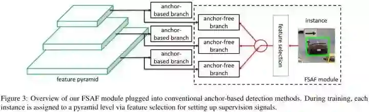 一个anchor-free的分支在每个特征金字塔层构建,独立于anchor-based的分支。和anchor-based分支相似,anchor-free分支由分类子网络和回归子网络。一个实例能够被安排到任意层的anchor-free分支。训练期间,基于实例的信息而不是实例box的尺寸来动态地为每个实例选择最合适的特征层。选择的特征层学会检测安排的实例。推理阶段,FSAF模块和anchor-based分支独立或者联合运行。