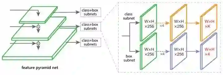 在RetinaNet的基础上,FSAF模块引入了2个额外的卷积层,这两个卷积层各自负责anchor-free分支的分类和回归预测。具体的,在分类子网络中,feature map后面跟着K个3x3的卷积层和sigmoid,在回归子网络中,feature map后面跟着4个3x3的卷积层和ReLU。