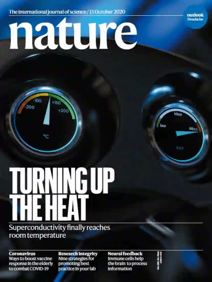2020 年 10 月 15 日,Nature 杂志以封面文章的形式发布了一篇关于常温超导的重磅论文,由美国罗切斯特大学物理系助理教授 Ranga Dias 带领的研究团队,创造出了一种碳质硫氢化合物固体分子,这种材料在约 15 摄氏度(288 K)和约 267 Gpa 的压强下表现出超导性。