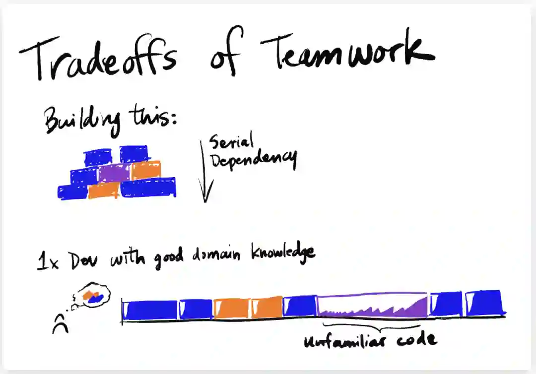 导致计算机并行化降低的因素是 CPU 上下文切换,以及如何将工作分解成可独立处理的块。在软件团队里,导致团队生产力降低的主要因素是沟通成本、工作依赖、领域专业知识和熟悉环境的速度。