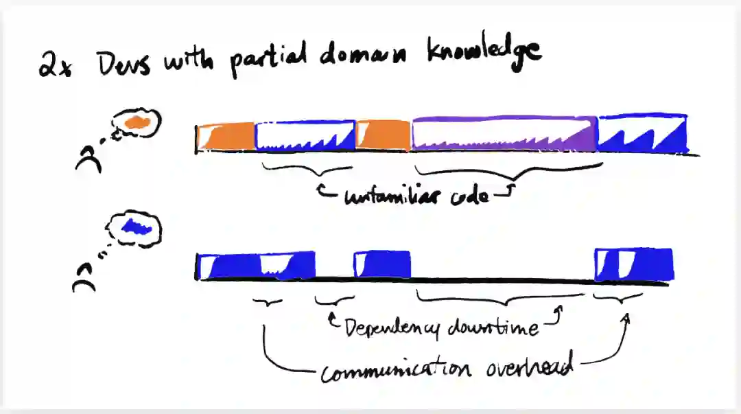 这两个开发人员的优势是他们可以并行地构建单独的块,但他们的并行性受到串行依赖关系 (一些块必须先于其他块放置)、理解不熟悉的代码和沟通成本的限制。