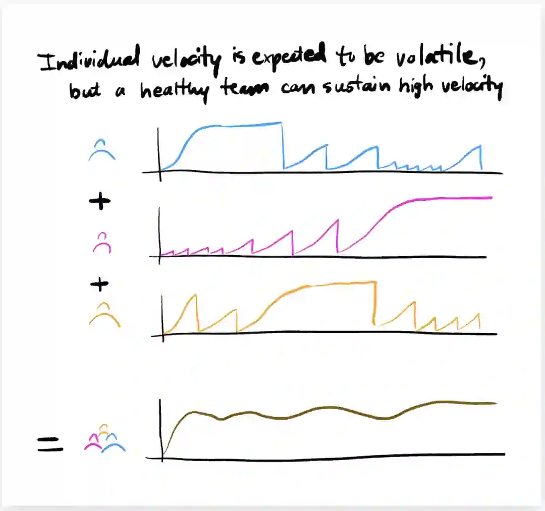 个体的速度往往是起伏不定的,所以不可避免地会花一些时间在不熟悉的代码上,或者一些外部因素中断了日常的编程进度。但是,当你把它们加在一起时,个体的凸起就变得平滑了。