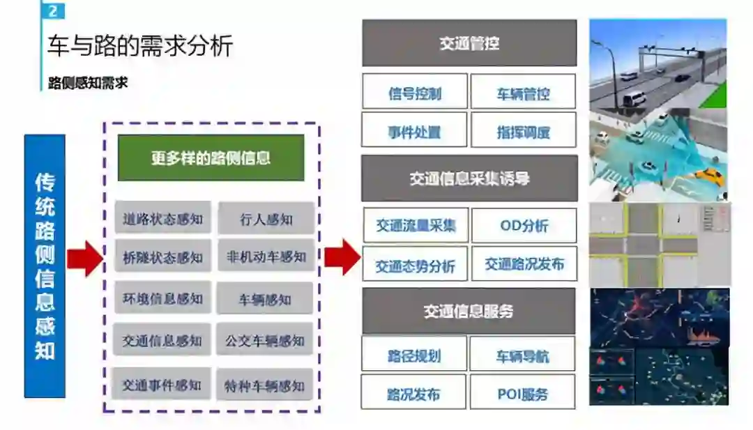 那路又是什么样的情况?在智能网联出现之前路的感知已经是非常丰富了,最早的线圈到微波、地磁、视频等等技术,已经能够把路口、快速路流量、车速、排队、滞留、号牌、违法等信息都可以感知到,感知到以后在交通管控、信息采集诱导、信息服务等做了很多应用。