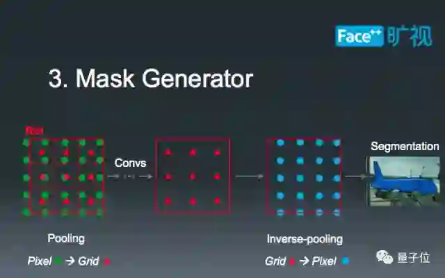 第三部分,也是最后一部分,我们精心设计了Mask的生成。在第二部扣取整合了Context之后,实际的ROI对应的GroundTruth已经发生了一定的坐标偏移,如图中红色小三角所示。在这种偏移下,我们不能直接用绿色格点对应的GroundTruth来计算loss(即蓝色格点)。此时,我们的做法是把ROI Feature重新插值到蓝色格点处,以此来精确计算Instance Segmentation的Loss。