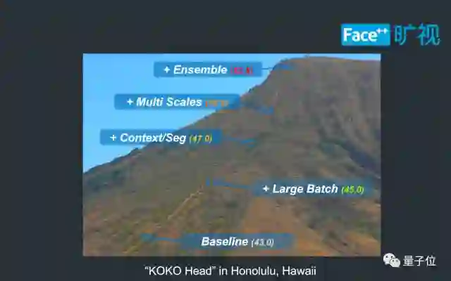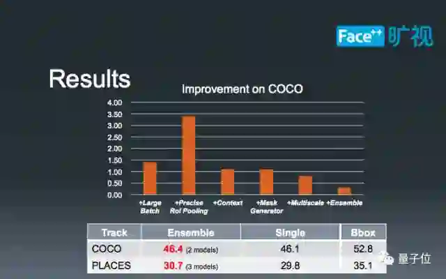 图中的柱状图展示了我们在相同基础下,增加不同模块导致的模型精度增加。可以发现,诸如Large Batch、MultiScale、Context和Ensemble的技巧是通用的,而另外两种方法则是Instance Segmnetation独享的。值得一提的是,我们在COCO Instance Segmentation中和第一名相差只有0.3,由于时间和资源的限制,我们只做了ensemble两个模型。如果可以ensemble四个模型,那么我们很有希望取得更优的结果。