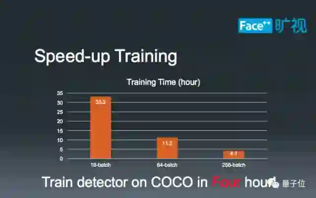 在COCO Detection比赛中,我们优先解决的是Batchsize的问题;回顾ImageNet Classification的工作,他们的Batchsize在训练过程中非常大,从起步开始就已经是128,最新的一些研究甚至达到了8000或者32K的水平,这使得人们可以在一个小时、乃至半个小时之内完成ImageNet的训练。