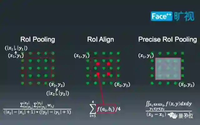 第一个部分是Pooling,也就是扣取特征图的过程。最原始的RoIPooling比较暴力。如左图所示,中间较小的红色虚线框是MegDet给出的ROI,由于浮点数的影响,这个框并不能完全对齐到绿色的特征图格点上。现有的计算逻辑是把红色的虚线框拉伸到外围红色虚线框,然后计算框中部分特征格点。最近,Mask-RCNN的提出将这个“硬”过程软化成了插值流程,即计算格点附近四个点的平均结果。而我们提出的Precise RoI Pooling讲这个过程做了进一步细化,即利用一个积分的过程代替插值过程,使得我们可以更好地扣取ROI对应的特征图。