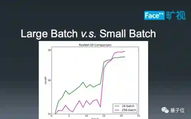 至此,我们可以比较一下不同年份,物体检测的Batch-Size规模。最初,2015年,人们使用2-batch来训练物体检测算法;过了一年之后,这个数字增长到了8倍,即16-batch;今年,在我们Megvii研究院的推动下,又增长到了256-batch,是原始Faster-RCNN的128倍,FPN的16倍。这个数字也恰好是ImageNet常见的Batch-Size。