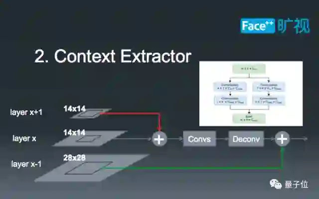 第二部分,是Context抽取部分,我们在COCO比赛中也使用了这个技巧来改善Detection的结果。如图所示,在第x层,我们扣去了一个14x14的ROI,同时我们在更小的特征图x+1上也扣取了相同尺寸的ROI,并通过两者的和作为一个初始ROI。在更大的特征图x-1上,我们扣取了更大的28x28区域,作为额外的Context,辅助分割。值得一提的是,我们在每个特征图上都增加了右上角所示的large kernel模块,这个模块已被证明在Semantic Segmentation中拥有非常好的效果,在Instance Segmentation中它也同样有效。