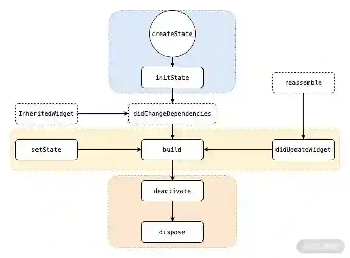 虽然三个 Widget 都是无状态的 StatelessWidget,但是因为 _MyHomePageState 的 State 改变时会重新执行 build 函数,所以三个 Widget 会重新创建,这也是为什么 WidgetA 虽然是无状态的 StatelessWidget 却依然可以动态改变的原因。