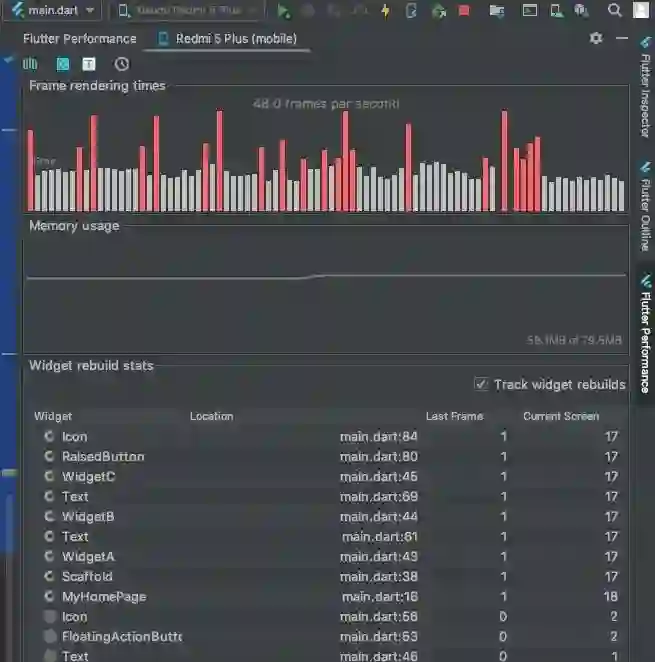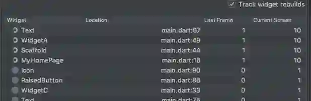 在 Flutter Performance 面板上选中 Track Widget Rebuilds 即可看到